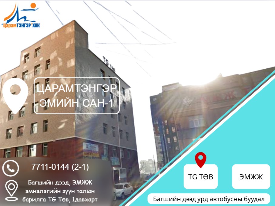 1. Царамтэнгэр эмийн сан 3 / ХУД, 19-н автобусны буудал, Сүмбэр Тауэр, 2давхарт /